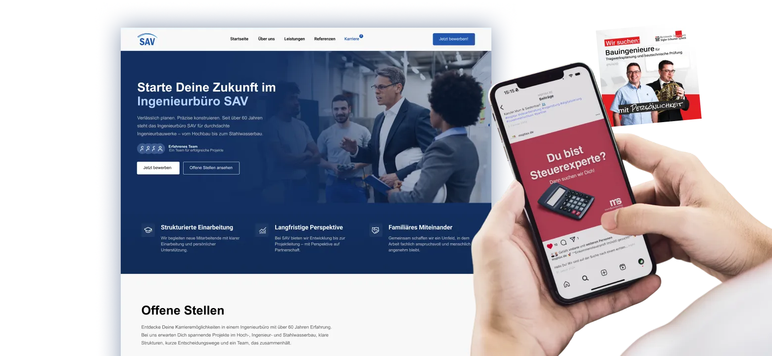 Wir machen Ihr Unternehmen als Arbeitgeber sichtbar – mit gezieltem Performance Recruiting und einem starken Employer Branding, das nachhaltig überzeugt.